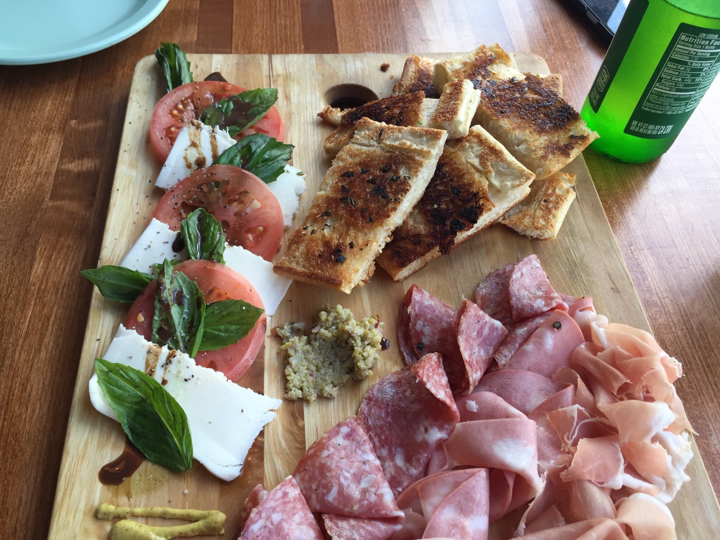 This consisted of toasted bread, a caprese salad, salami, mortadella, prosciutto, mustard, a small amount of what appeared to be tapenade, and pickled cabbage (I think). OH, and a random (inedible) toy soldier on the board.
