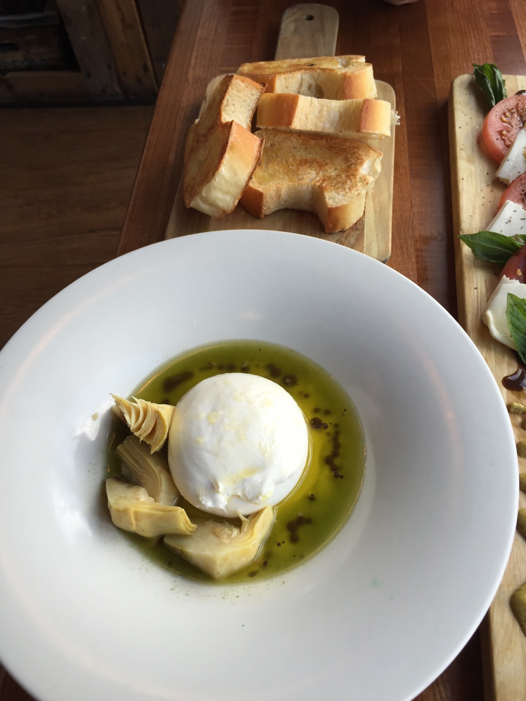 In addition to the charcuterie, we also ordered a Burrata. Initially in the description, it mentioned that the Burrata would come with caper berries, olive oil, and a basil oil….we later found out AFTER, that they had run out of caper berries, so they replaced it with artichoke. Would have been nice if we were told that at the beginning…