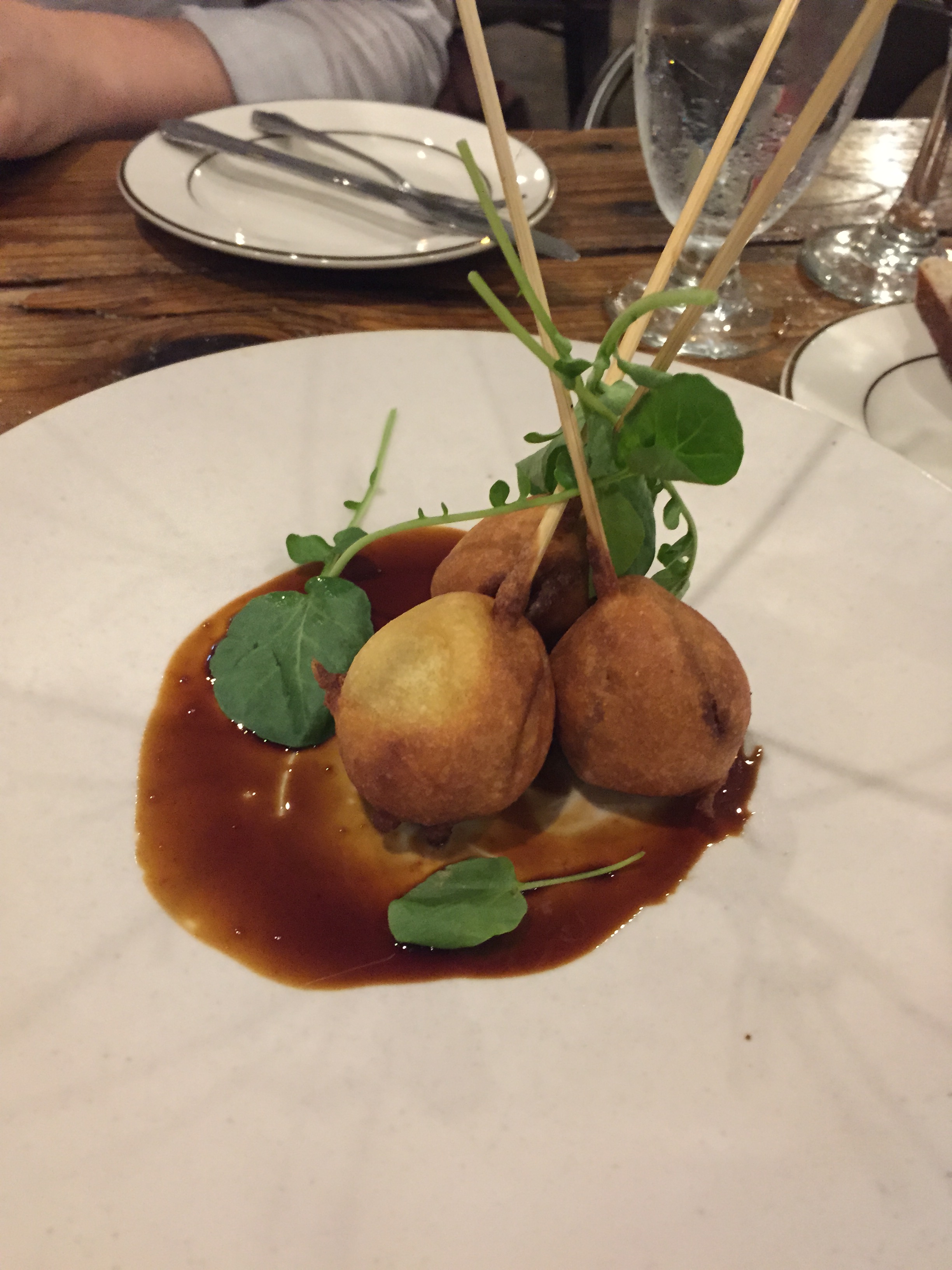 Not your typical corn dog. Inside was a spiced sausage…reminded me a little of a breakfast sausage. The sauce on the plate was pretty good, and it harmonized well with the bready exterior and the tender meat. Great dish.
