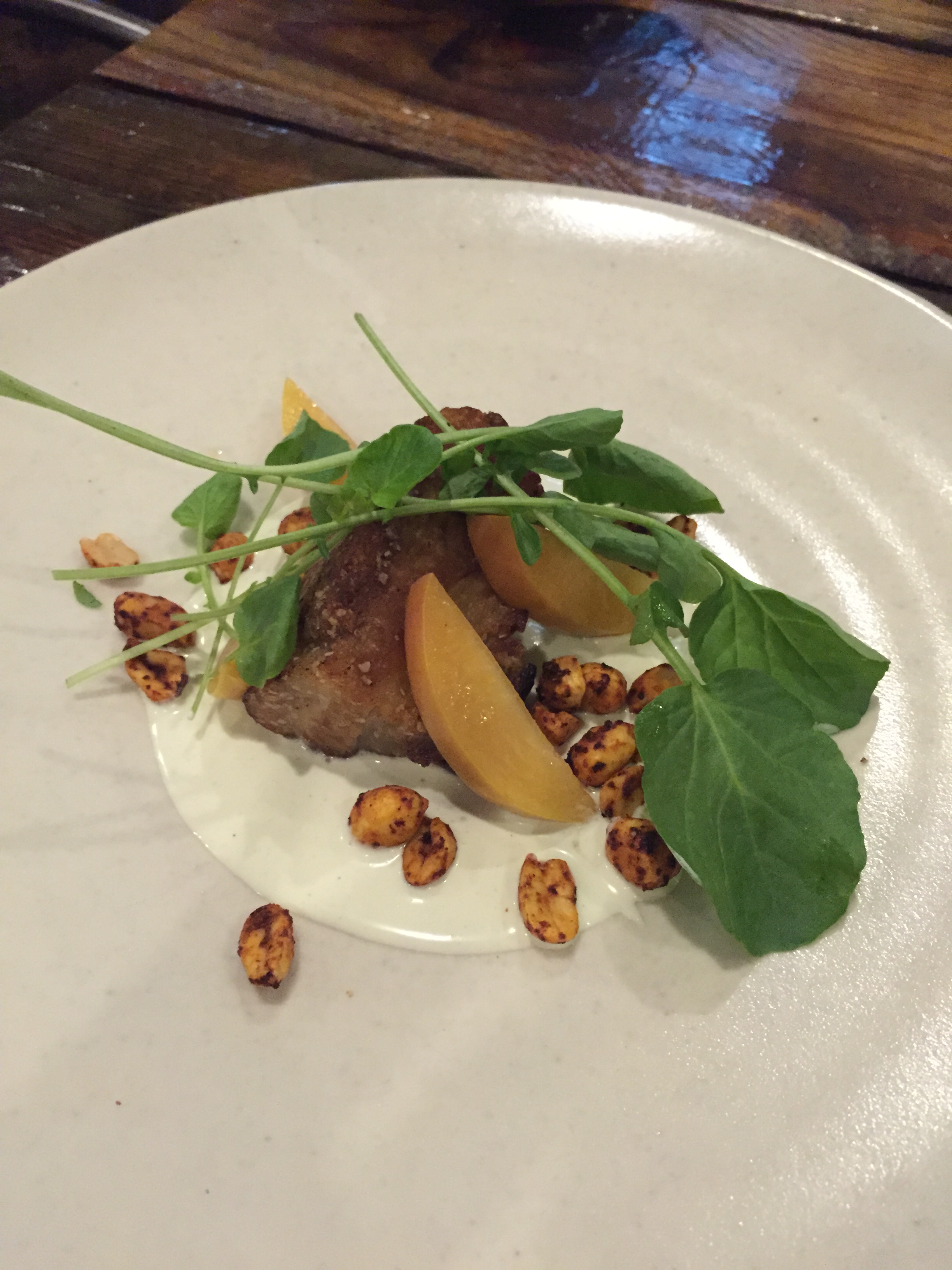 Second appetizer: Pork belly with pickled peaches, spicy peanuts, and cardamom cream.
