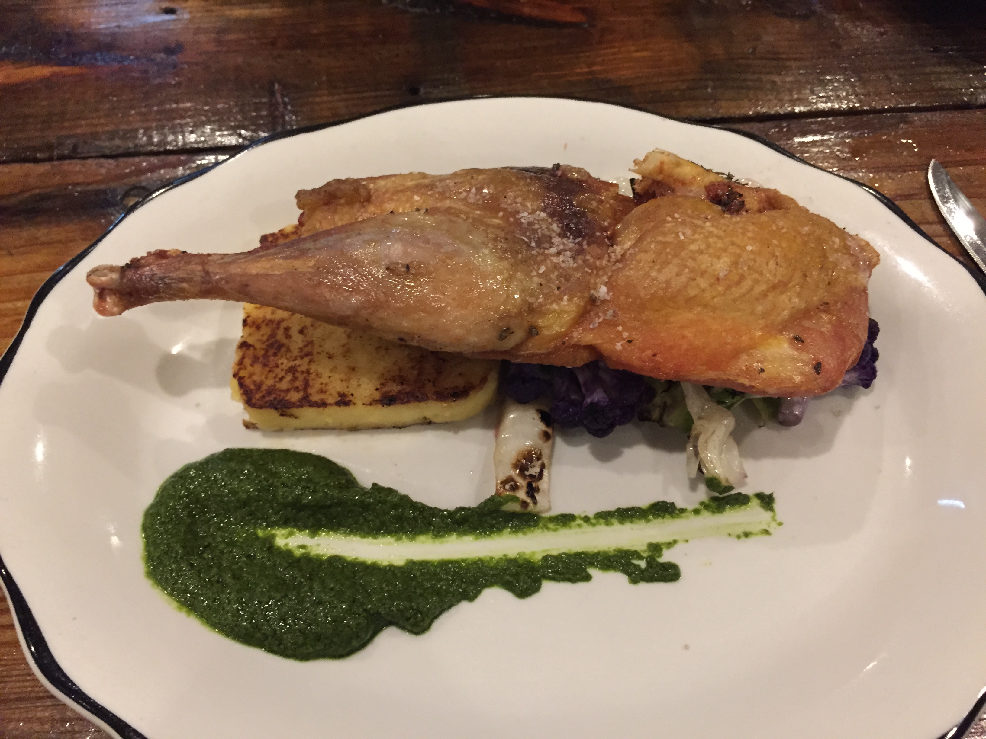 This entree really disappointed me; I was super excited when the waitress told me how the pheasant was cooked: hay smoked, then sous vide, then deep fried. I was expecting something rich in flavor, crunchy on the outside, and super juicy on the inside.