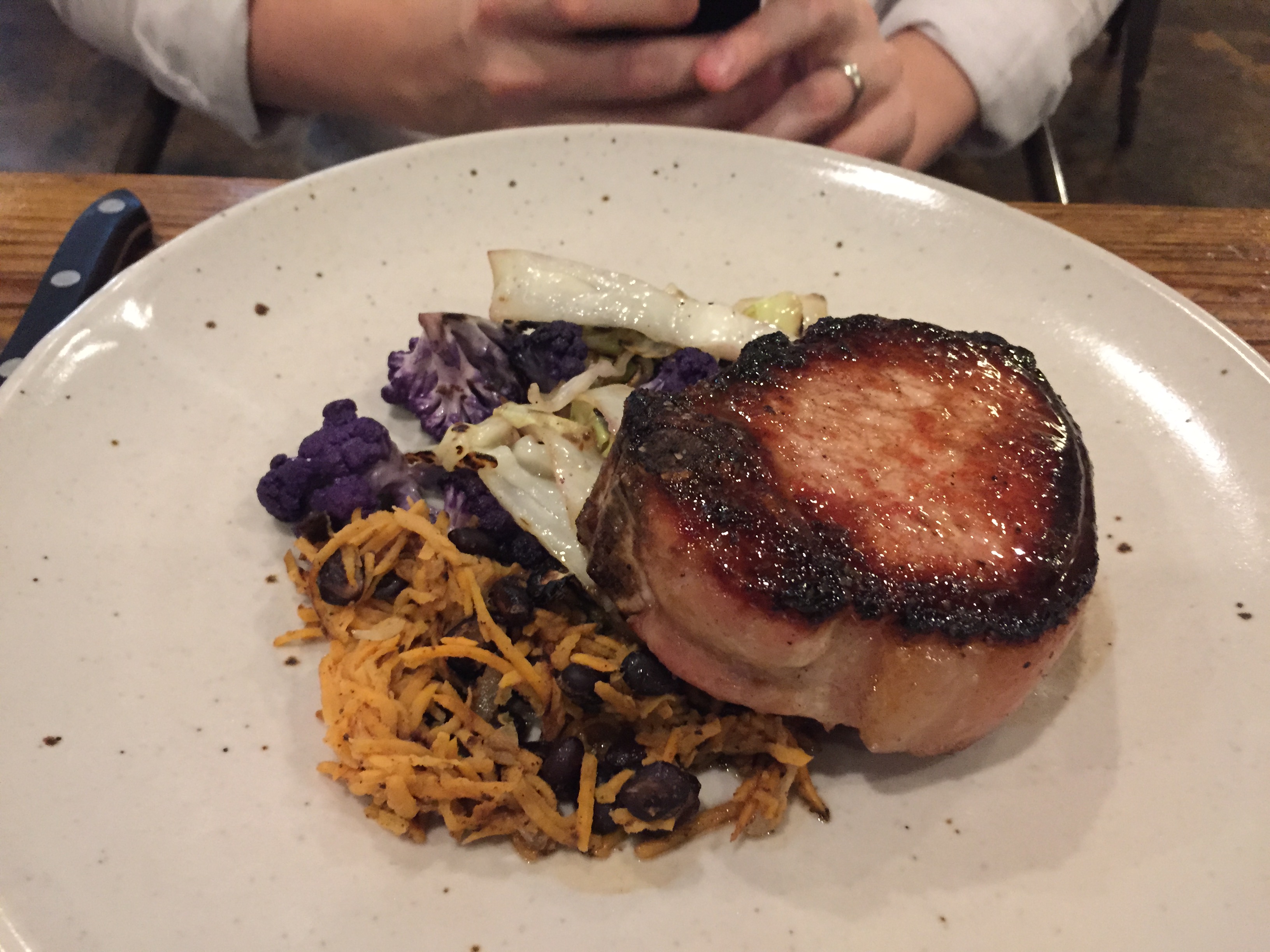 My husband’s entree: Center cut pork with a coffee butter glaze, and a sweet potato/black bean hash.