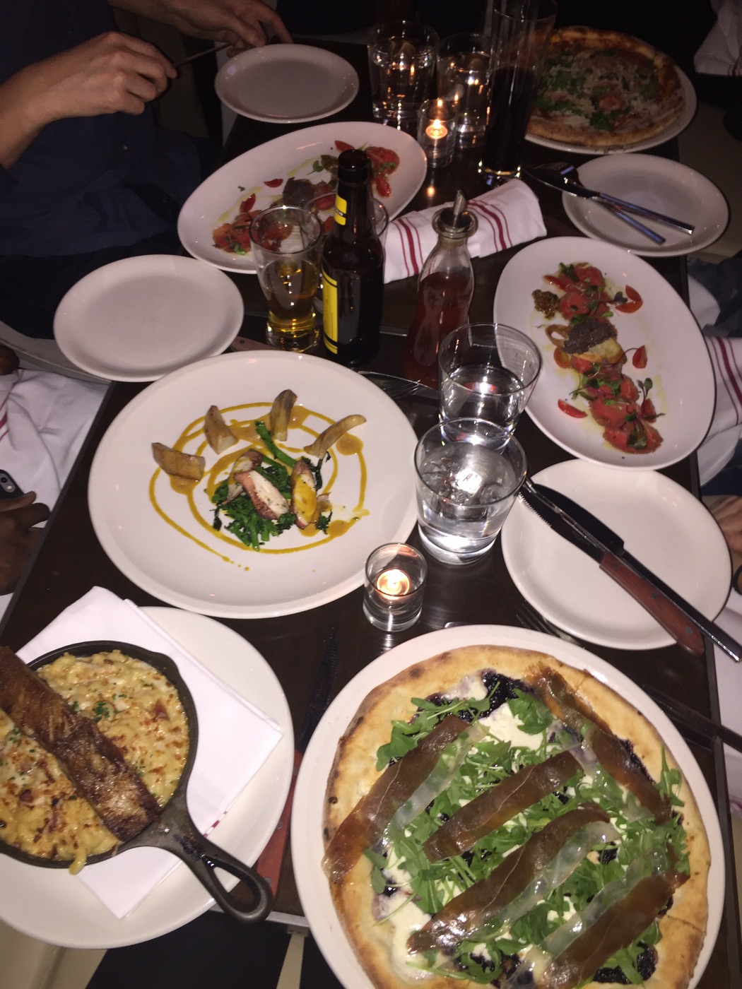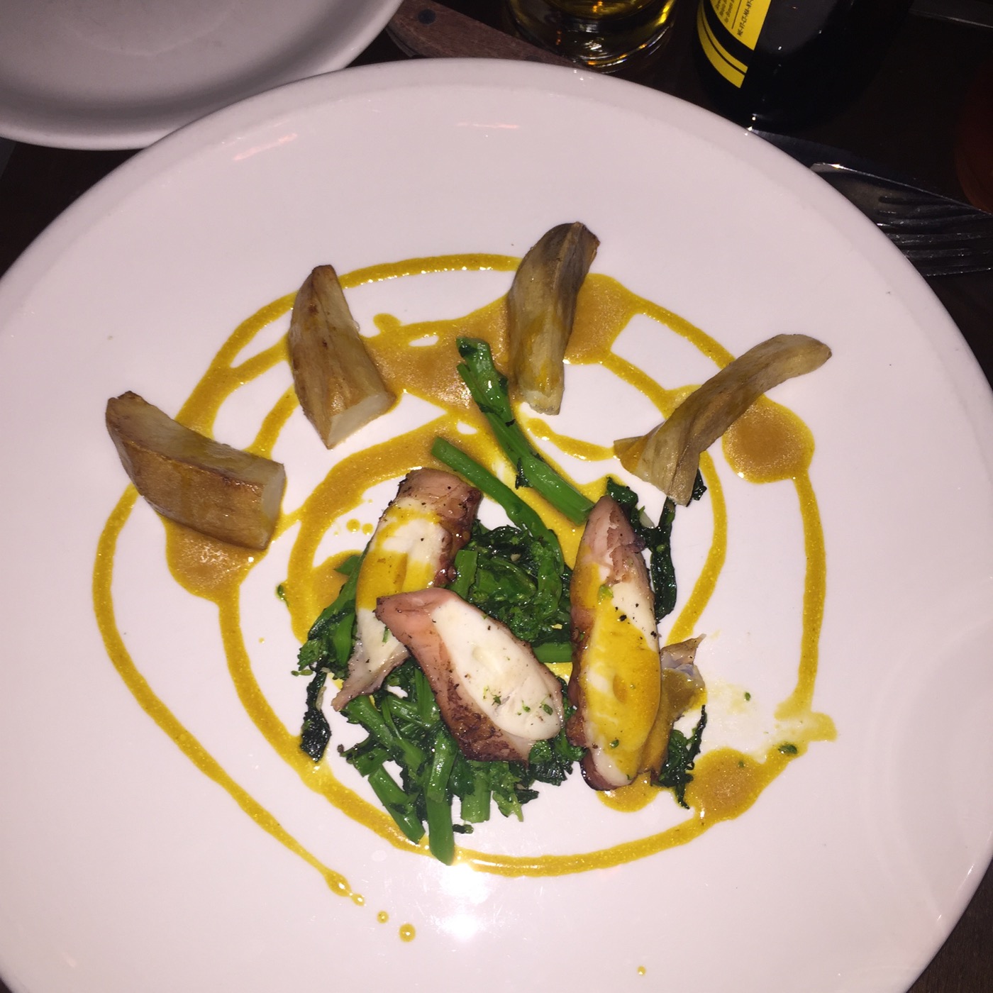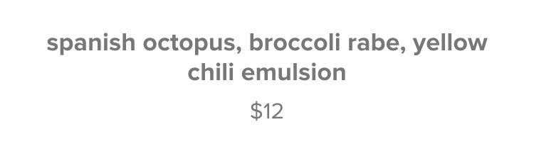 The broccoli rabe was a great complement, as it was not bitter, or too “green” tasting, if that makes sense. Something like kale would have overwhelmed the flavors, but the broccoli rabe was delicate enough to not take away from the star of the plate. The potato wedges that were laid out surrounding the octopus, were also very well cooked. Not too mushy, not too crisp. I loved this appetizer. Every drop, every leaf, every grain.