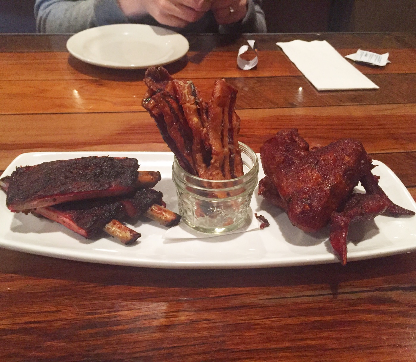 Sample appetizer: ribs, candied bacon, chicken wings