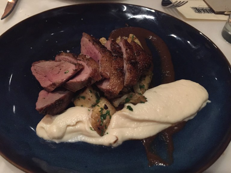 Lastly, the Seared Duck Breast: white root puree, figs, roasted parsnips, black garlic & fig puree. If this was supposed to have figs, I didn’t see or taste any (aside from the puree). Way to miss an ingredient in yet another dish. I neglected to mention earlier in this post that my husband’s drink, which was supposed to have liquor infused cherries in it, in fact did NOT come with any of said garnishment. #FAIL. This is strike three for the missing ingredient count. They did, however, add cauliflower. I don’t know about you, but I don’t find cauliflower to be a reasonable replacement for figs.