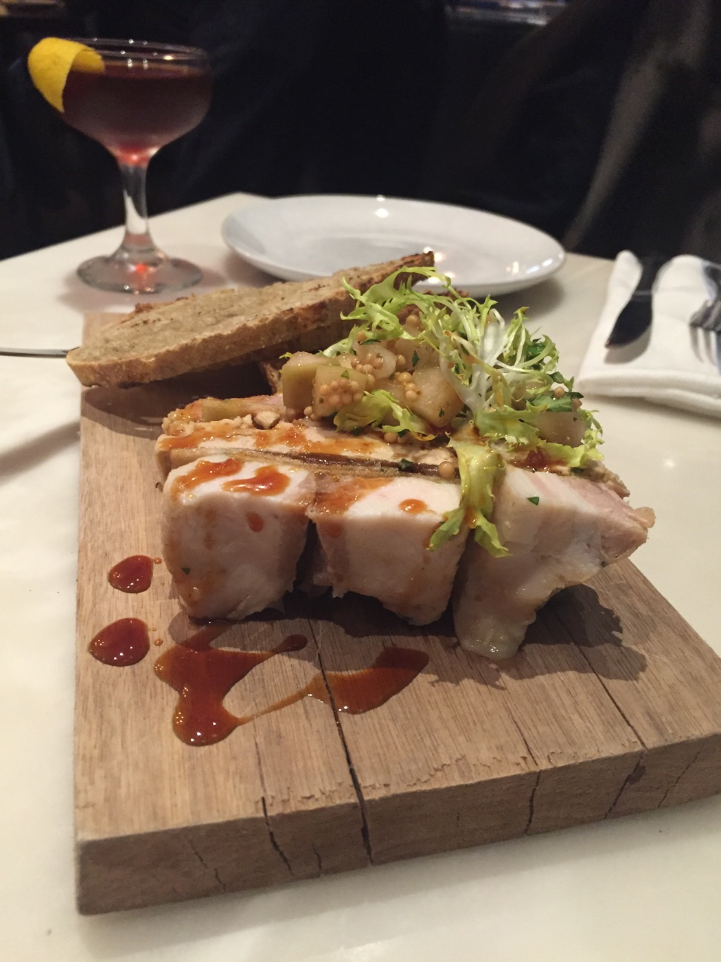 Above is the Foie Gras Terrine, which allegedly featured house pork belly, smoked trout, carmelized Michigan apple, apple mustard, whipped blue cheese, and walnut. I say “allegedly” because the whipped blue cheese and walnut were nowhere to be found in or around this dish….which quite frankly, is fine with me because I don’t like blue cheese.