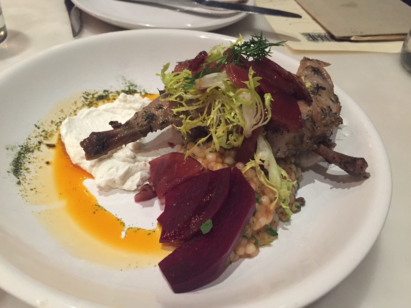 Confit Rabbit: tomato water cous cous, smoked yogurt, roasted yellow beets.