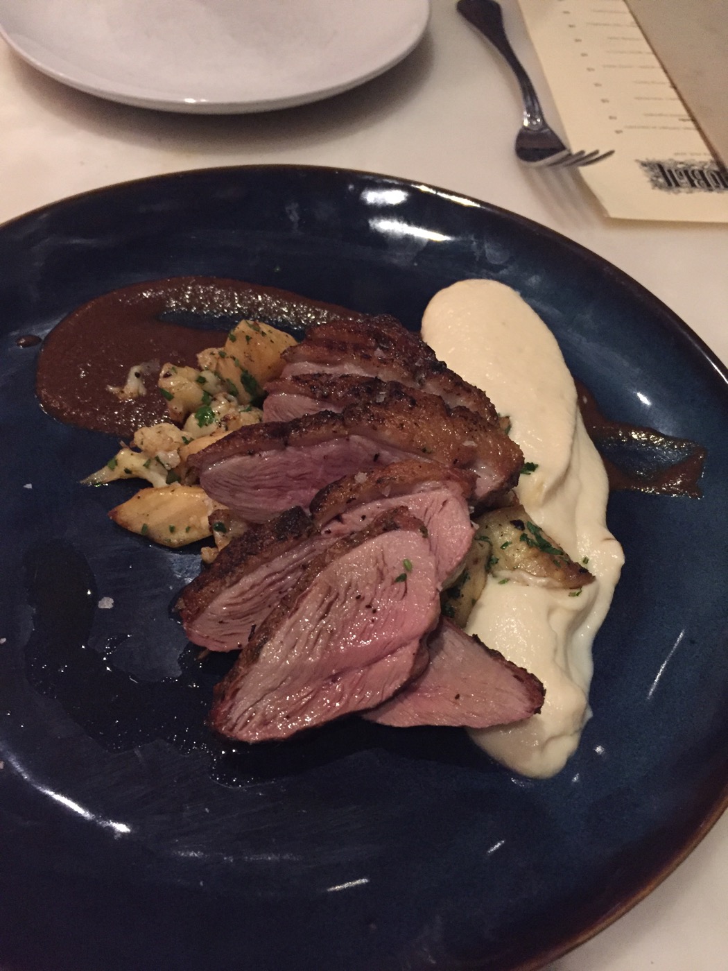 Lastly, the Seared Duck Breast: white root puree, figs, roasted parsnips, black garlic & fig puree. If this was supposed to have figs, I didn’t see or taste any (aside from the puree). Way to miss an ingredient in yet another dish. I neglected to mention earlier in this post that my husband’s drink, which was supposed to have liquor infused cherries in it, in fact did NOT come with any of said garnishment. #FAIL. This is strike three for the missing ingredient count. They did, however, add cauliflower. I don’t know about you, but I don’t find cauliflower to be a reasonable replacement for figs.