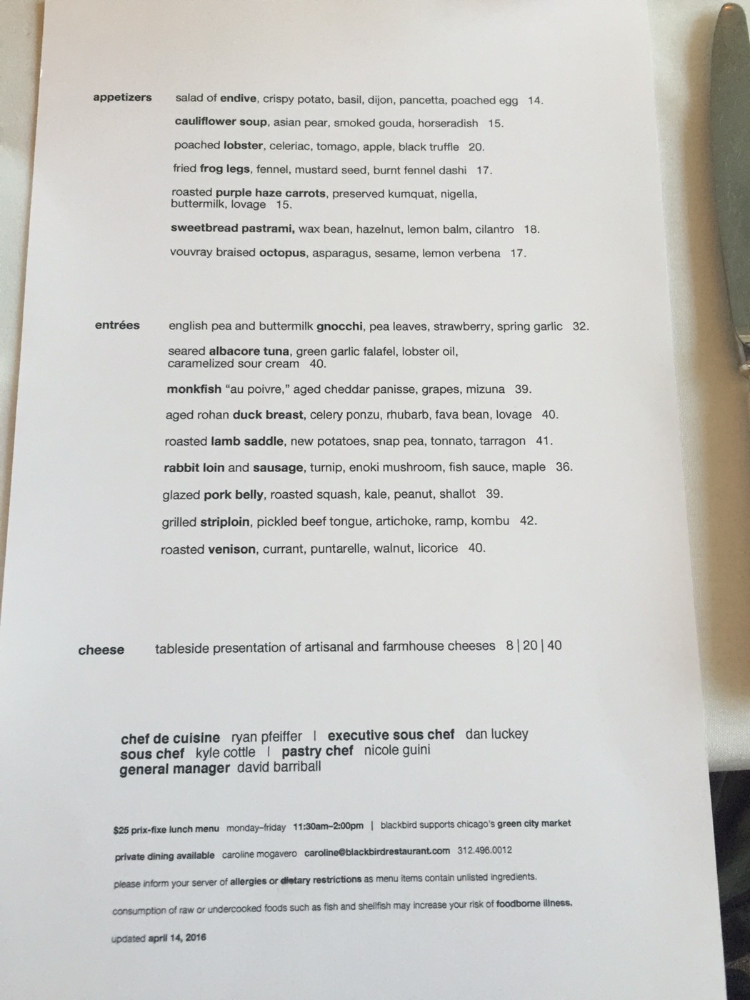 Blackbird is a hip little Michelin Star restaurant in Chicago.