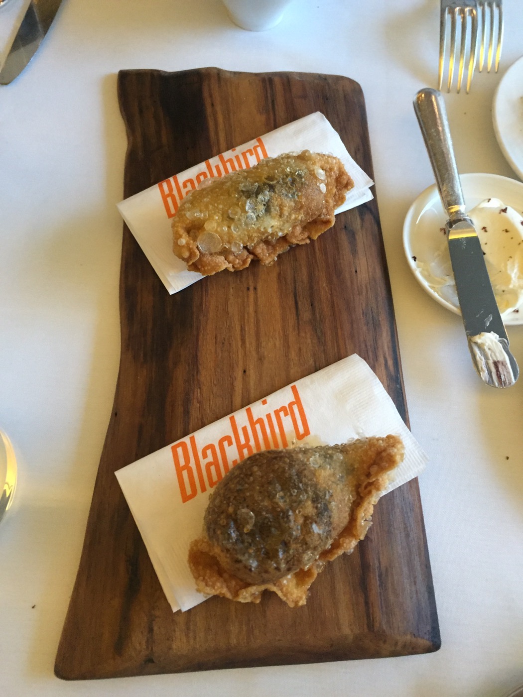 The fish was amazing! The charred pomelo was a fabulous addition to the fish, as it added tropical citrus. This was the beginning of the salt problem for me. It wasn’t too obvious, but the salt was definitely noticeable. The oyster was cooked perfectly too. I am not the biggest fan of cooked oysters, but Blackbird did it right, and I wanted more. My only issue with it was that it felt misplaced. It’s just kind of hanging out on the rim, lonely, on top of some random puree. Tasty, but incredibly random, and not well incorporated.