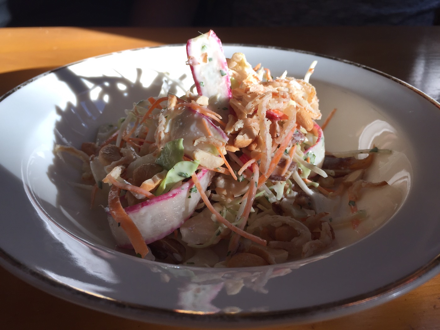 This was definitely Asian inspired. It had Japanese mayo and cilantro flavoring, with crunchy bits of the pigs ears and peanuts. The pigs ears didn’t seem like the star of the plate, but more of a finishing garnish, as if they could be replaced with fried wonton chips or tortillla strips. Not a bad side dish.