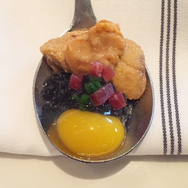 Erizos Con Caviar: caviar, sea urchin and quail egg spoon with Iberico Jamon.