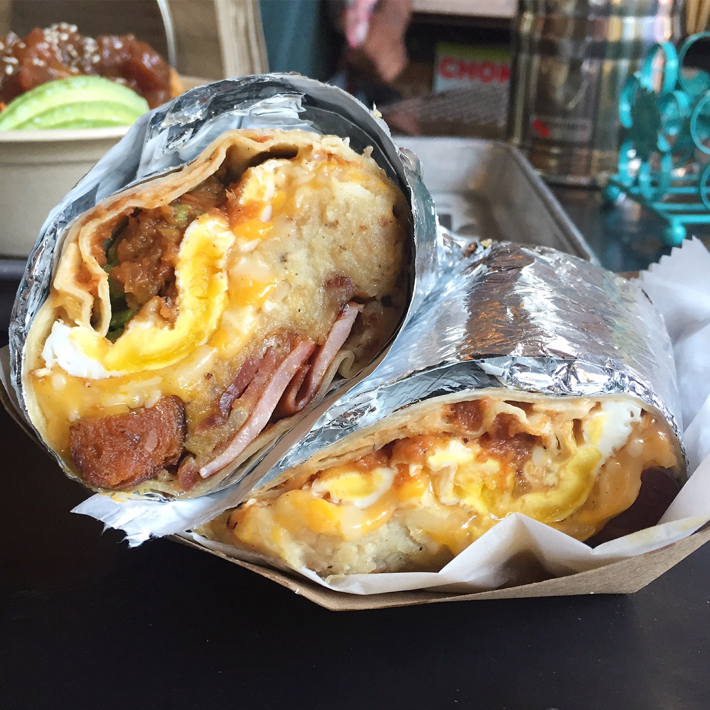 The Plan B-Rito has Filipino longanisa stuffed into a very hearty hangover cure of a breakfast burrito. Potatoes, eggs, cheese, ham, salsa….I mean, come on…what more can you ask for!?