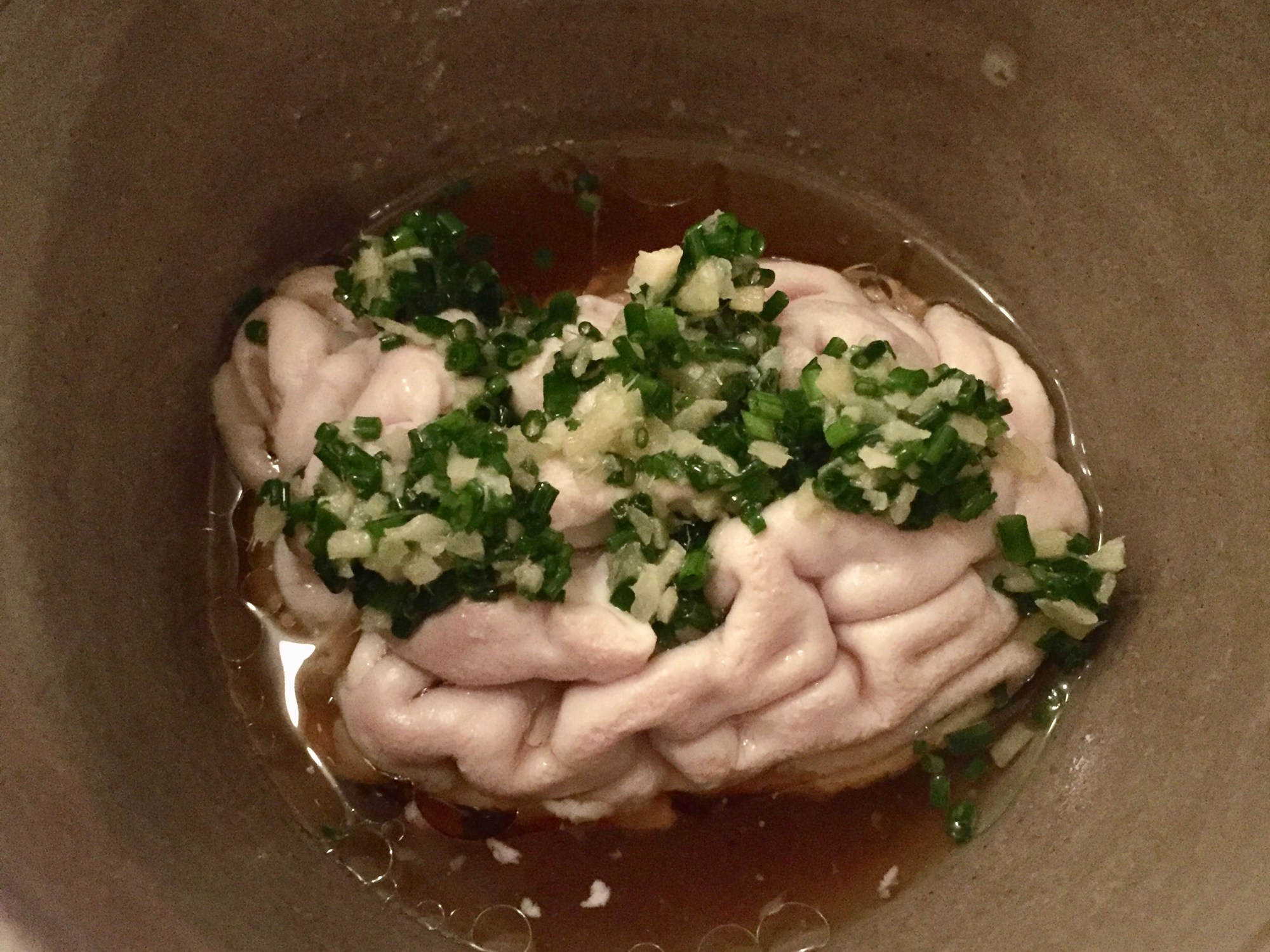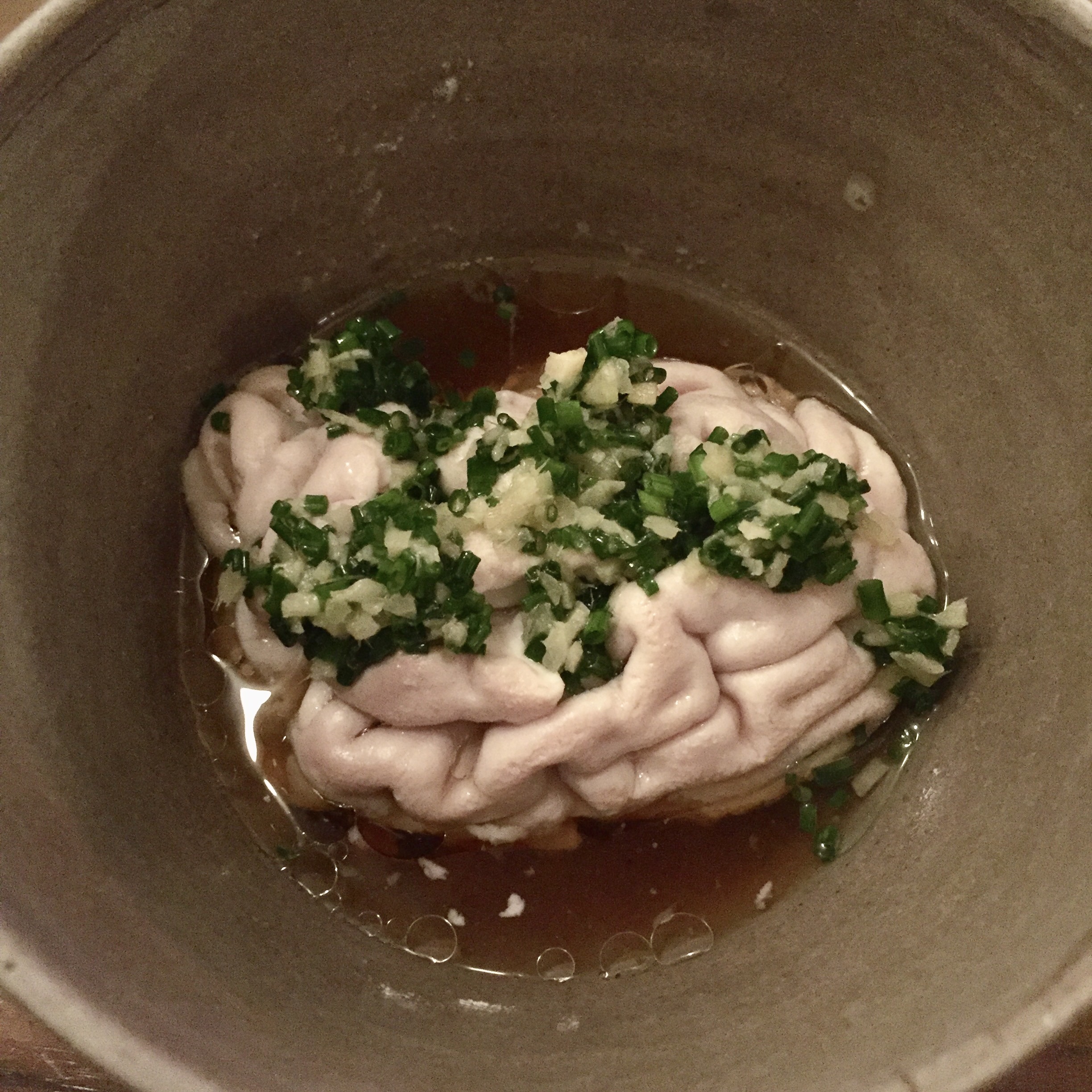 Not so much the taste, but the consistency. It was like a gritty, soft serve, soft tofu that just kind of mushed and formed a congealed shape. It took on the taste and aroma of the liquid it had been bathing in…an Asian inspired ginger onion broth…..but no matter the taste, my brain couldn’t get past the fact that I had a baby cow’s mushy, pasty, gritty, squishy brain melting on my tongue. It is still sad and gross to think about, 7 months later.