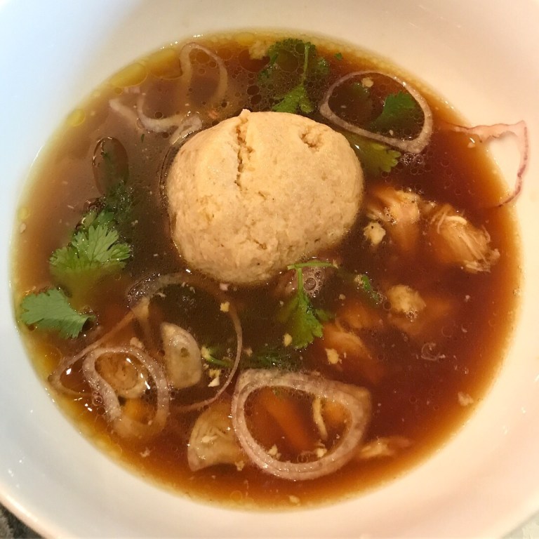 I’m not a huge fan of hummus, and I’ve eaten enough shakshouka in the past year to ward off any future cravings. And Matzo [matza/matzah] ball soup? I’ve had my fair share of Jewish mothers making me matzo ball soup, along with having it at delis here and in New York….it has never really impressed me or ranked in my top soups, until now.